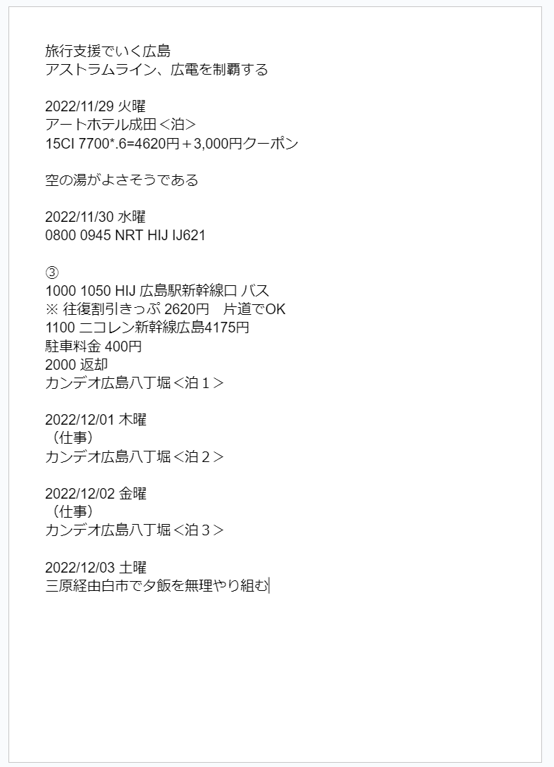 当時は旅行支援がまだ残っていたので使いました。旅程のメモには旅行支援でいく広島と書かれていました。