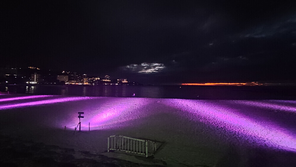 日が暮れてきて暗くなるとライトが砂浜に向けて放たれていました。